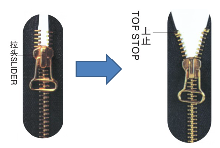 - 本機將金屬顆粒上止緊固在拉鏈上止端。
